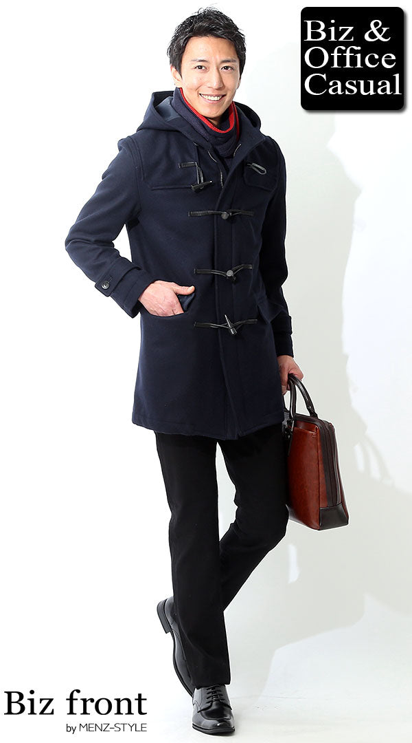 ネイビーメルトンダッフルコートを主役にした、オフィスカジュアルの決定版スタイルです。ダッフルコートの親しみやすさとネイビーの上品さが、チームを率いる大人の男性にぴったり。黒スリムパンツでスタイリッシュにまとめ、ストライプマフラーがアクセントになっています。