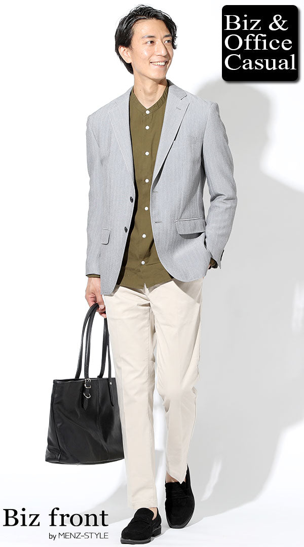グレーのヘリンボーン柄ジャケットとカーキバンドカラーシャツ、オフホワイトテーパードスラックスを組み合わせた、落ち着いた大人の男性の雰囲気を演出するコーディネートです。ビジネス40%カジュアル60%のバランスで、オフィスカジュアルからプライベートまで幅広く活用できます。