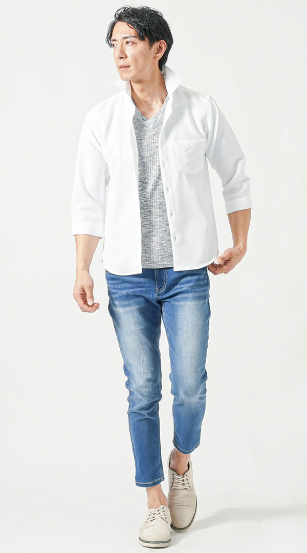 白七分袖シャツ グレー半袖VネックTシャツ ブルースキニーアンクルデニムパンツ グレーシューズ snp_pr1467のコーディネート例