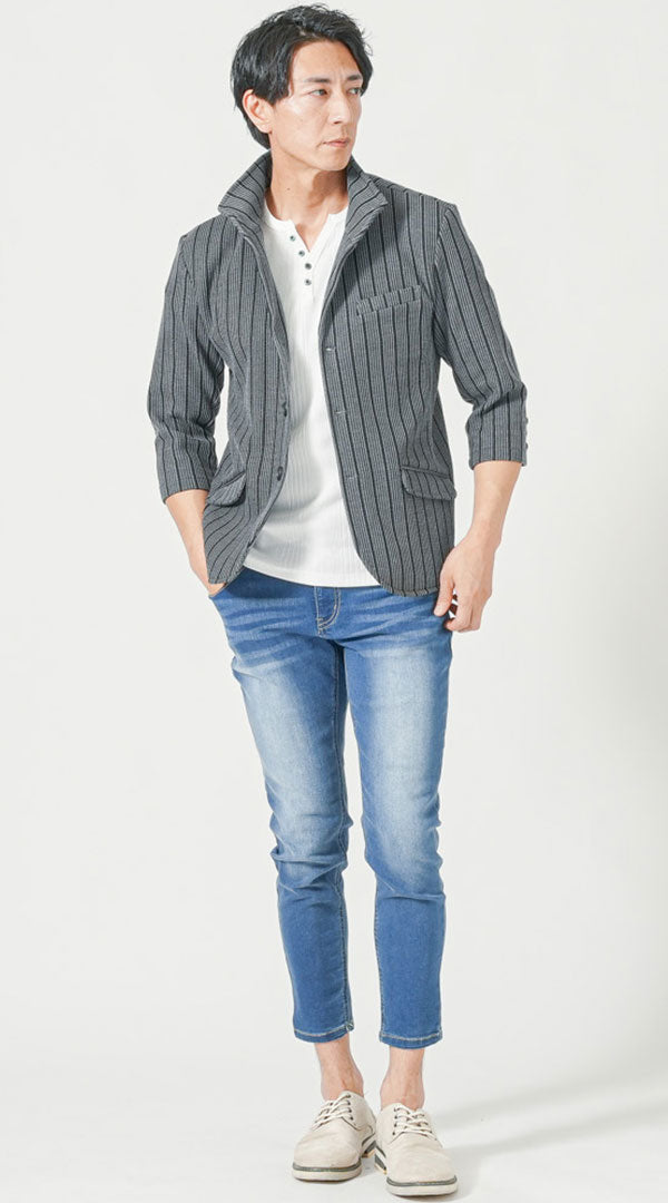 グレー七分袖スタンドカラージャケット 白七分袖Tシャツ ブルースキニーアンクルデニムパンツ グレーシューズ snp_pu1425のコーディネート例