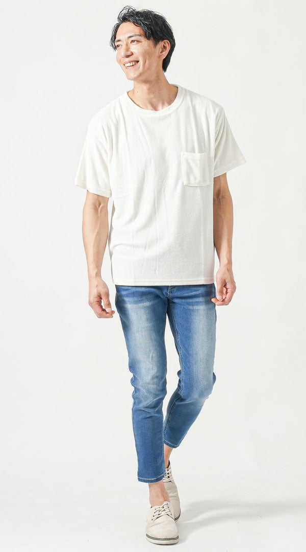 白半袖クルーネックTシャツ ブルースキニーアンクルデニムパンツ グレーシューズ snp_pr1435のコーディネート例