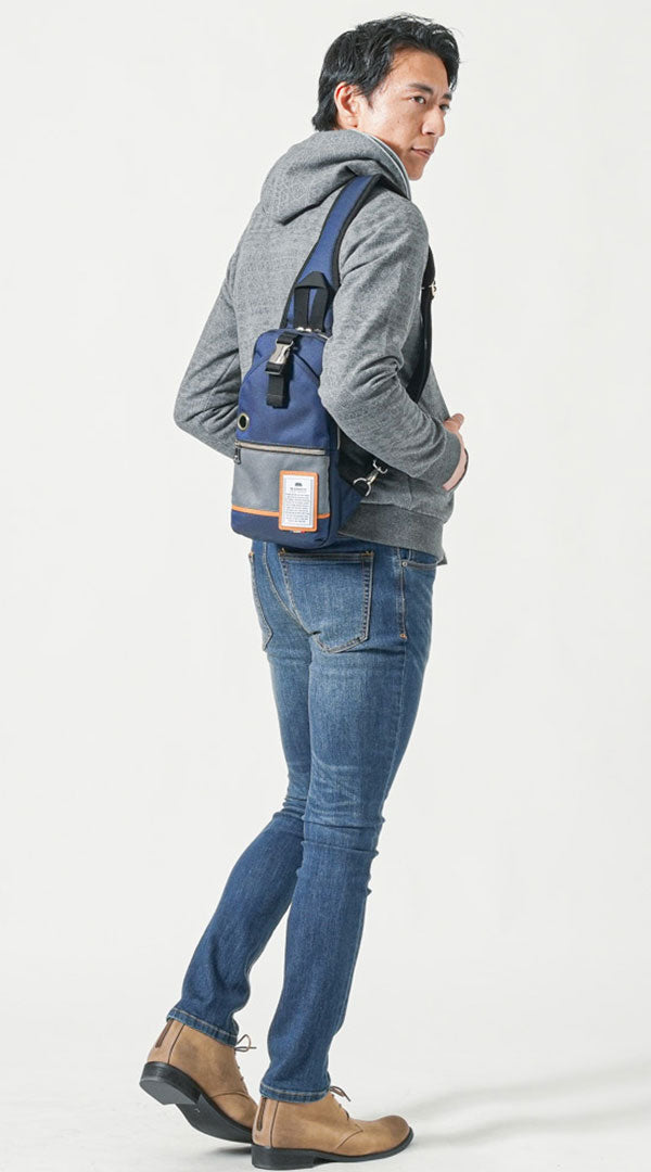 グレージップパーカー 白長袖VネックTシャツ ネイビーテーパードデニムパンツ ベージュチャッカブーツ ネイビーボディバッグ snp_pl1263のコーディネート例