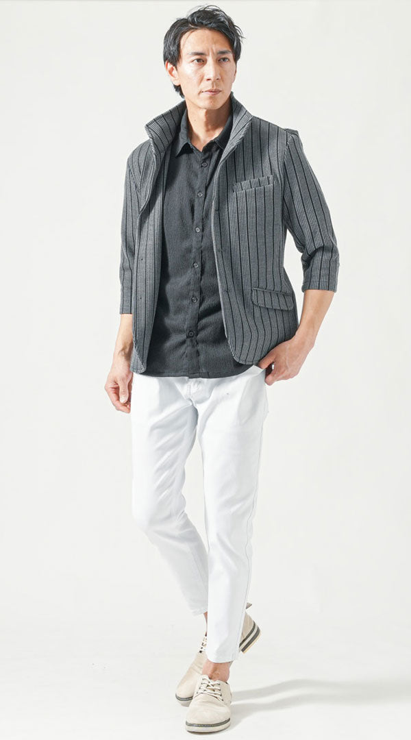 グレー七分袖スタンドカラージャケット 黒七分袖シャツ 白スキニーテーパードアンクルチノパンツ グレーシューズ snp_pq1127のコーディネート例