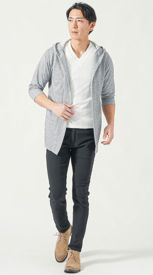 このコーディネートは、グレーの七分袖ロングカーディガン、白の半袖VネックTシャツ、黒のスキニーチノパンツ、ベージュのチャッカブーツで構成されています。特に40代・50代の男性に適したスタイリッシュな印象を持ち、春夏に最適な軽快さを実現します。まず、グレーの七分袖ロングカーディガンは、軽やかな素材で涼しさを保ちながらも、羽織ることでおしゃれ感を一段引き上げます。次に、白の半袖VネックTシャツは、首元をスッキリ見せ、明るい印象を与える要素として機能します。このシンプルな色合いは、他のアイテムとの相性も抜群です。下半身には、黒のスキニーチノパンツを選ぶことで全体のシルエットを引き締め、スタイリッシュなラインを作り出します。ベージュのチャッカブーツが足元をしっかりと支え、カジュアルさと品の良さを両立させます。このコーディネートは、日常のカジュアルシーンからビジネスカジュアルまで幅広く対応し、どのシーンでもスマートな印象を与えます。春夏シーズンの新しいスタイルを探している方には、ぜひ取り入れていただきたいおすすめの組み合わせです。
