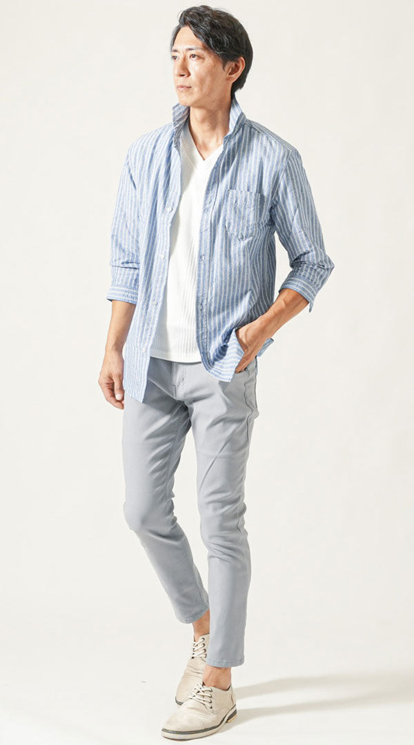 ネイビーストライプ七分袖ホリゾンタルカラーシャツ 白半袖VネックTシャツ 黒スキニーアンクルチノパンツ グレーシューズ snp_px0451のコーディネート例