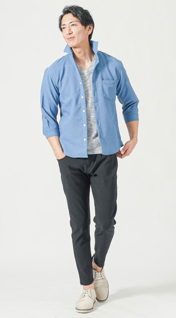 趣味の良い印象を与えるサックスブルーの七分袖シャツは、軽やかな生地感が特徴で、季節の変わり目に最適なアイテムです。グレーの半袖VネックTシャツとの重ね着で、カジュアルながらも知的なスタイルを実現。さらに、黒のスキニーテーパードアンクルチノパンツがシルエットを引き締め、全体のバランスを整えます。足元にはグレーのシューズを合わせることで、全体に統一感を持たせながら、クリーンで趣味の良い印象を演出します。このコーディネートは、ビジネスカジュアルシーンや週末の外出にぴったりで、シーンを問わず活躍します。日常の中でちょっとした特別感を味わいたい方におすすめのスタイリングです。