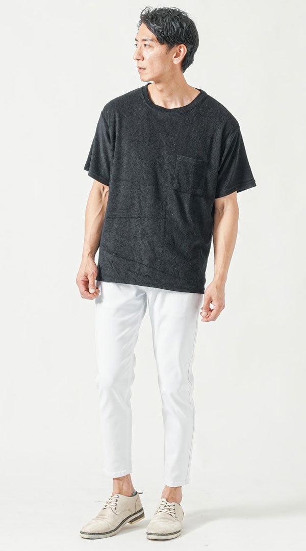 黒半袖クルーネックTシャツ 白スキニーテーパードアンクルチノパンツ グレーシューズ snp_pr1932のコーディネート例