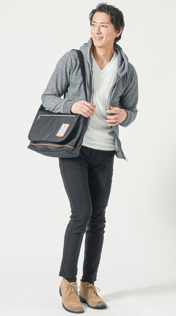 グレージップパーカー 白長袖VネックTシャツ 黒スキニーチノパンツ ベージュチャッカブーツ 黒メッセンジャーバッグ snp_pn1183のコーディネート例