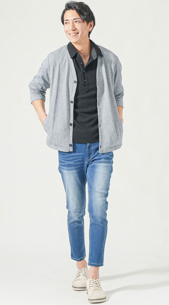 ブルー七分袖カーディガン 黒ポロシャツ ブルースキニーアンクルデニムパンツ グレーシューズ snp_ps1598のコーディネート例