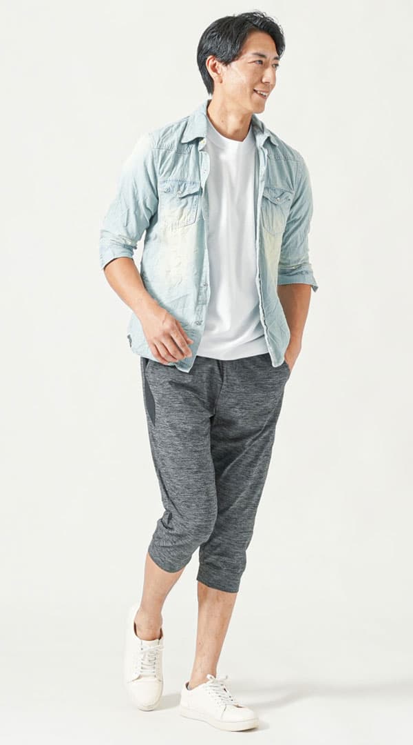 ブルー七分袖デニムシャツ 白半袖クルーネックTシャツ グレードライストレッチクロップドパンツ 白スニーカー snp_pw0410のコーディネート例