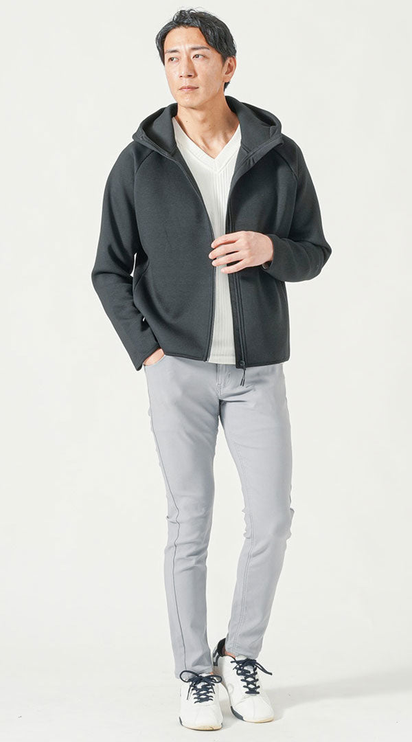 黒ジップパーカー 白長袖VネックTシャツ グレースキニーチノパンツ 白スニーカー snp_po0766のコーディネート例
