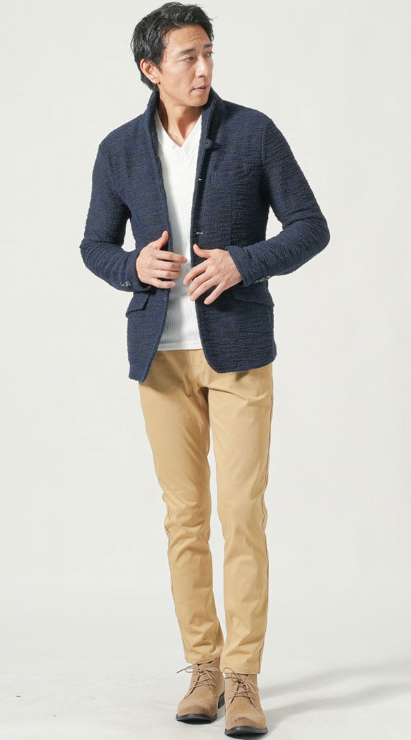 ネイビーカラージャケット 白長袖VネックTシャツ ベージュスキニーテーパードチノパンツ ベージュチャッカブーツ snp_pl1851のコーディネート例