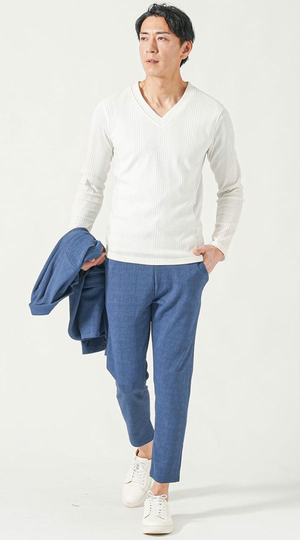 ネイビーテーラードジャケット 白長袖VネックTシャツ ネイビーテーパードアンクルパンツ 白スニーカー snp_po0629のコーディネート例