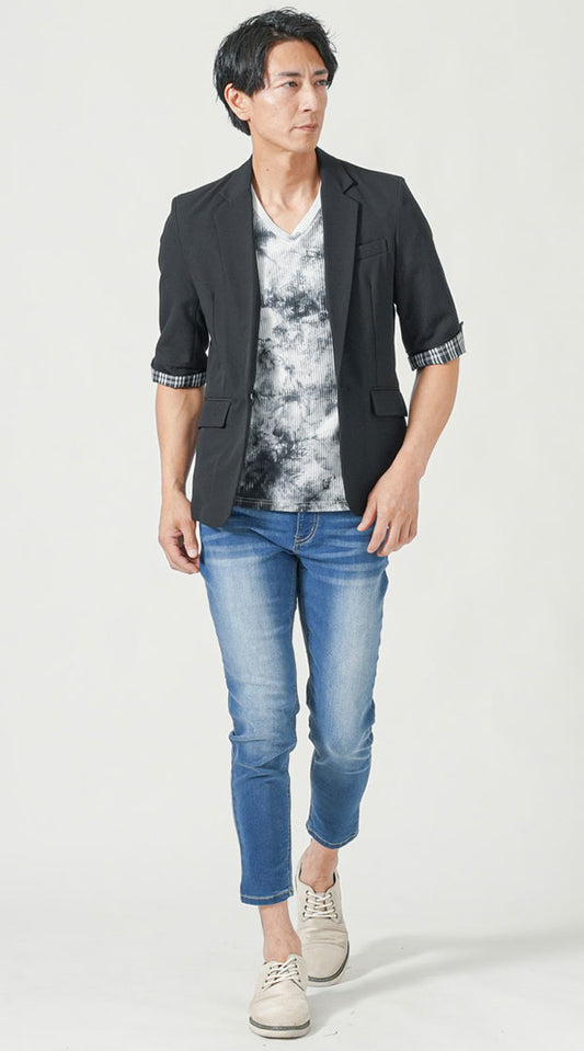 黒ジャケット 白ポロシャツ ブルーデニムパンツ snp_jp1588のコーディネート例