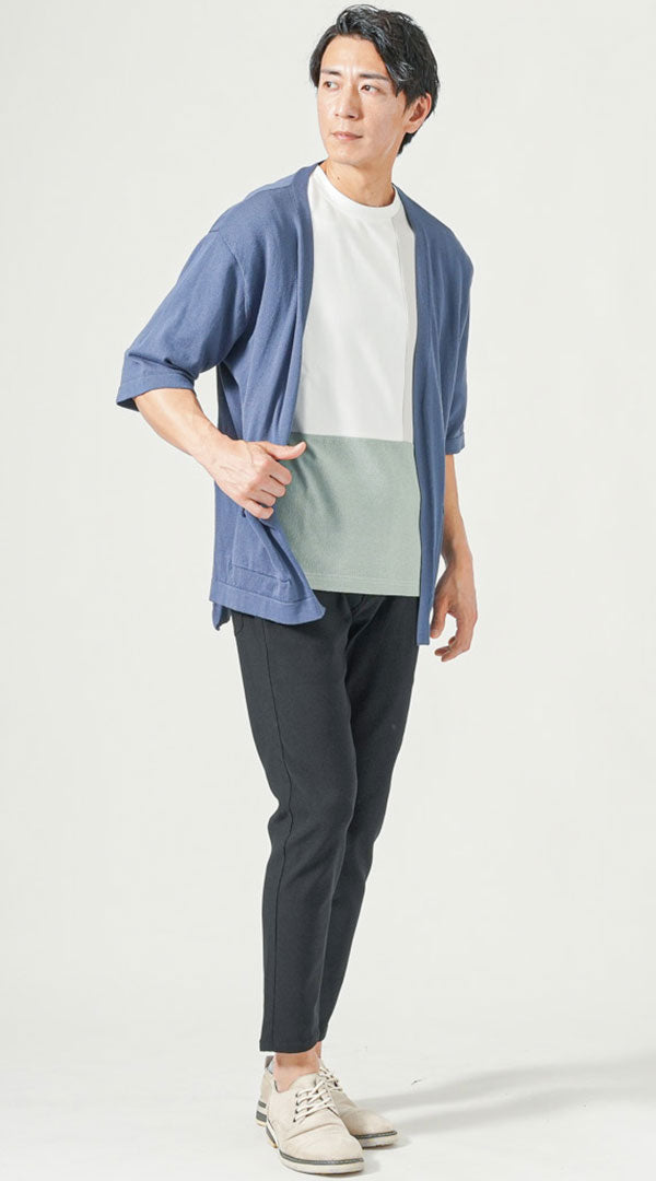 ブルーの五分袖カーディガンは、軽やかな素材感で通気性が良く、春から初夏の季節にぴったりです。内側に施された繊細なステッチは、ノーブルな印象を与えつつも、カジュアルな着こなしを可能にします。白の半袖クルーネックTシャツは、シンプルでありながらその存在感を引き立て、どんなスタイルにも合わせやすいベーシックアイテムです。これに黒のスキニーテーパードアンクルチノパンツを組み合わせることで、全体が引き締まり、エレガントさとトレンド感を兼ね備えたコーディネートが完成します。さらに、グレーのシューズを取り入れることで、色彩に深みが加わり、ノーブルな印象を与えることができます。このスタイリングは、ビジネスシーンやカジュアルな外出時にも最適で、シーンを選ばず自信を持って着こなすことができるでしょう。