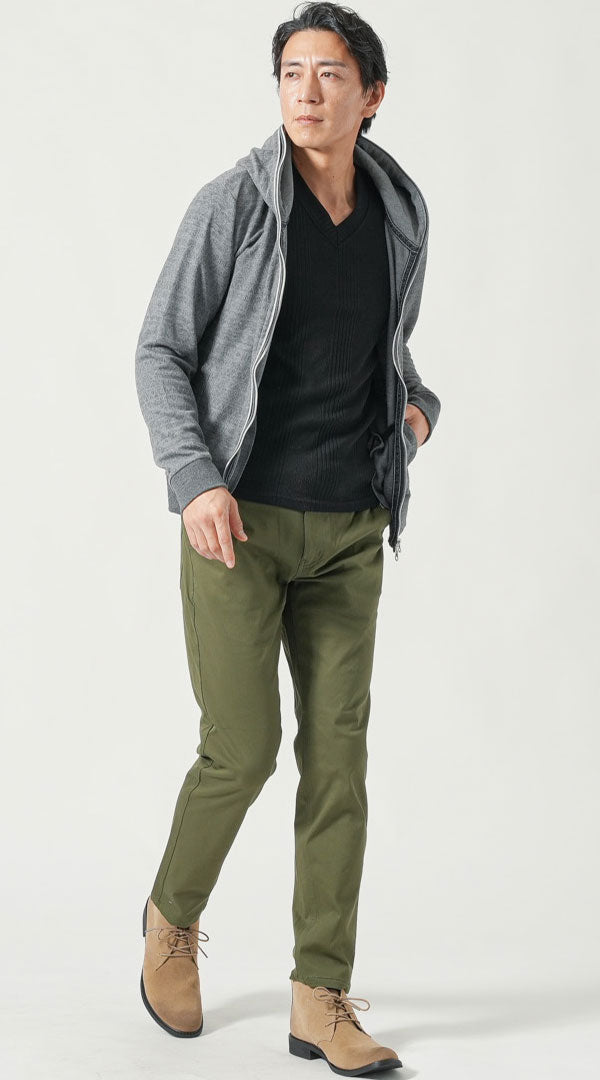 グレージップパーカー 黒長袖VネックTシャツ カーキスキニーテーパードチノパンツ ベージュチャッカブーツ snp_pl0048のコーディネート例