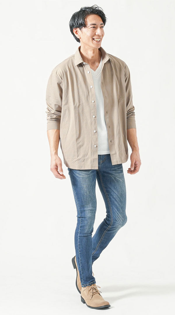ベージュ長袖シャツ 白半袖VネックTシャツ ネイビーテーパードデニムパンツ ベージュチャッカブーツ snp_pr0366のコーディネート例