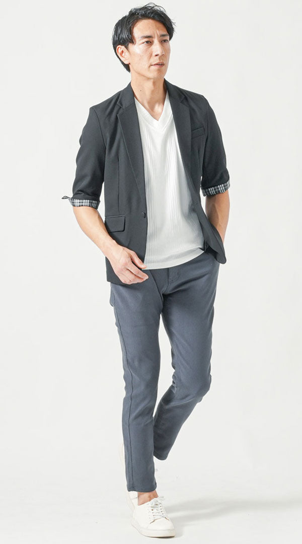 黒五分袖テーラードジャケット 白半袖VネックTシャツ チャコールグレースキニーテーパードアンクルチノパンツ 白スニーカー snp_pr1693のコーディネート例