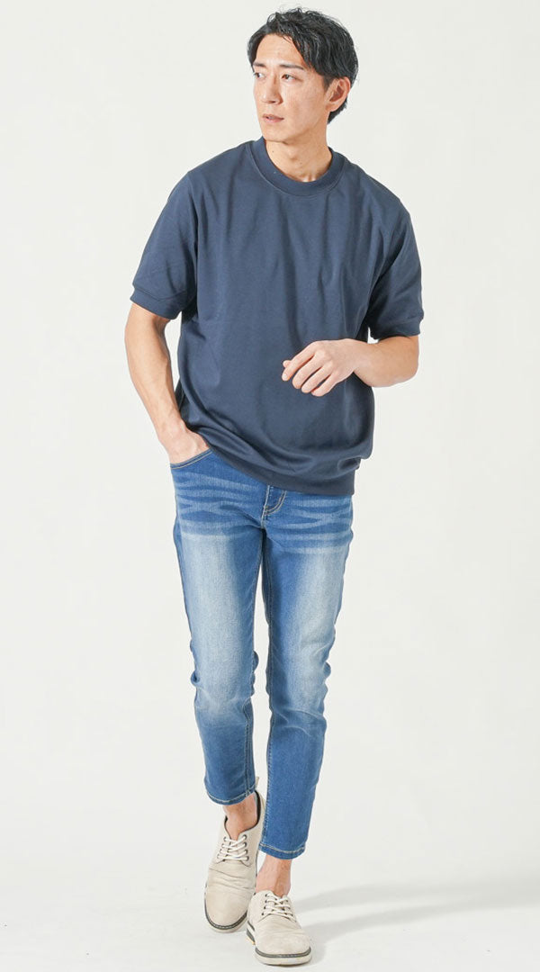 ネイビー半袖クルーネックTシャツ ブルースキニーアンクルデニムパンツ グレーシューズ snp_po1255のコーディネート例