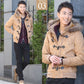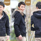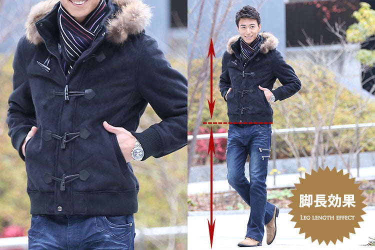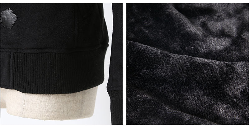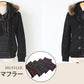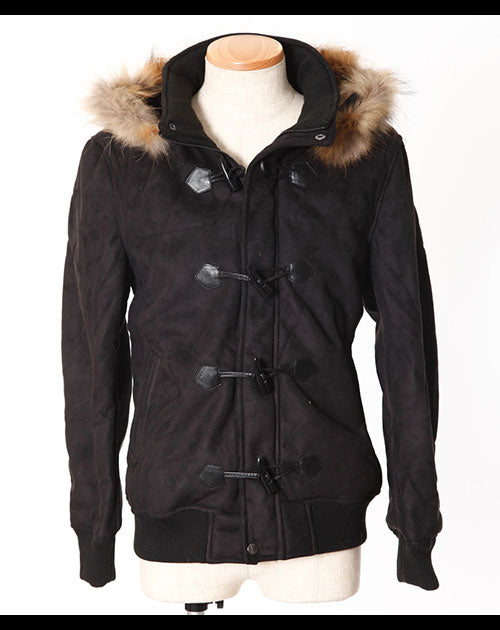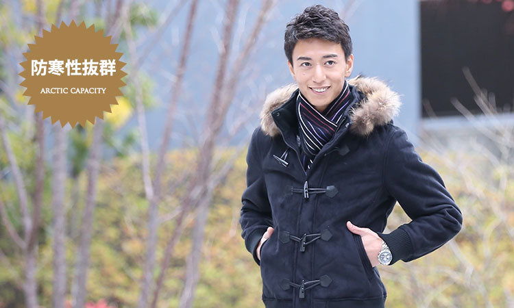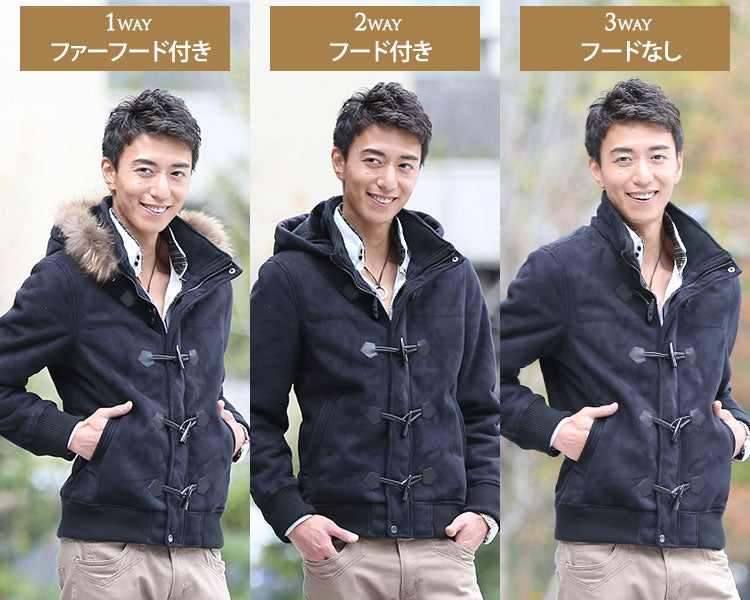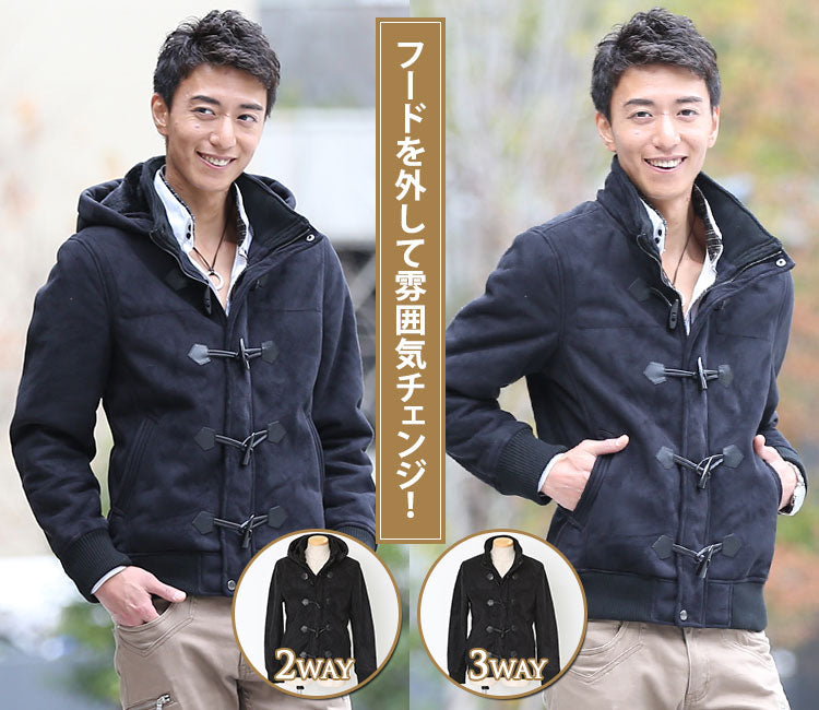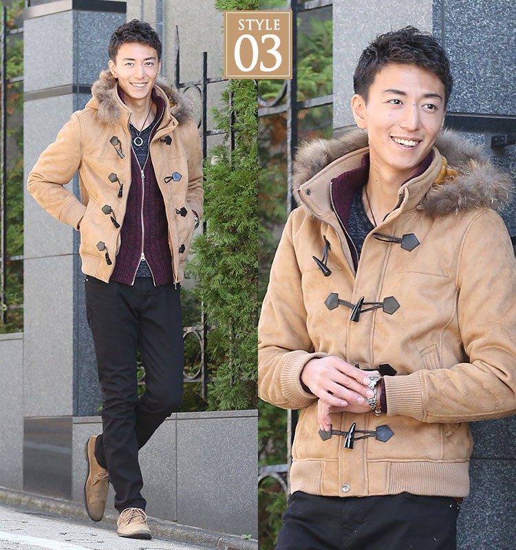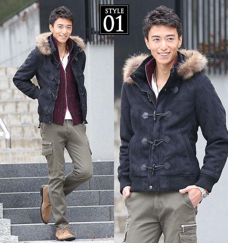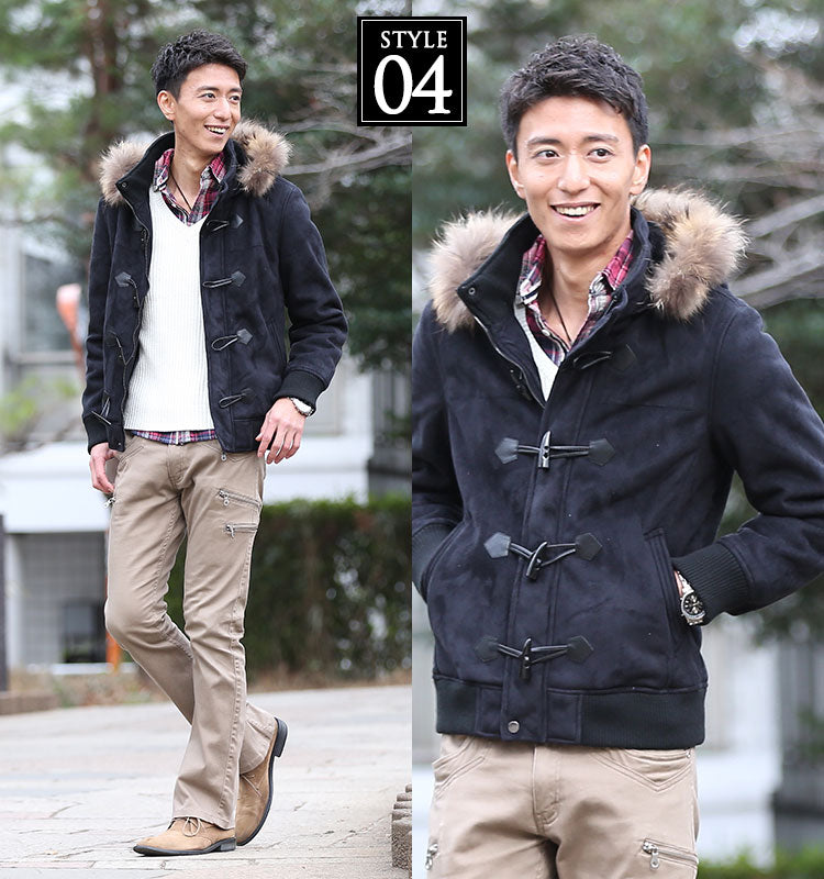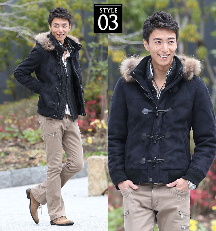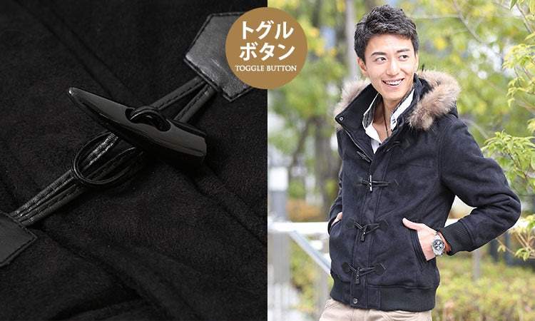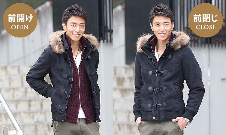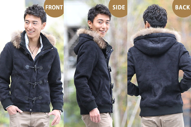 黒を基調とした男らしさを感じさせる風貌。PUレザー部分は男らしさに高級感と上品さをプラスしてくれる。PUレザーを光沢感ある色合いだとどうしても浮いてしまうのでフェイクムートン生地に自然と馴染むようにマットな色合いにしました。この細かいこだわりがこのコートの高級感を作ってくれているんです!
