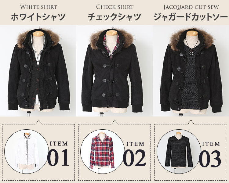 人気のシャツ×スタンドニットの組み合わせ!そこに高級感のあるフェイクムートンコートで派手すぎない雰囲気の着こなしにまとめました!男らしくまとめつつも、スタイリッシュなチノパンでまとめることで大人な雰囲気も感じさせてくれちゃいます♪