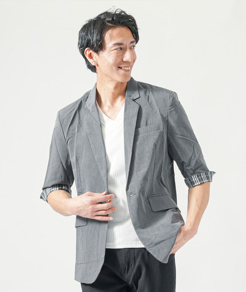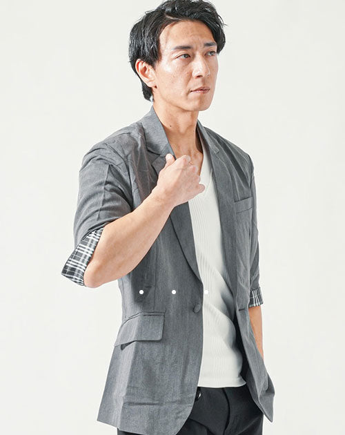 ランダムテレコ素材ヘンリーネック7分袖・半袖Tシャツ 袖裏デザイン5分袖テーラードジャケット 袖裏デザイン5分袖テーラードジャケット