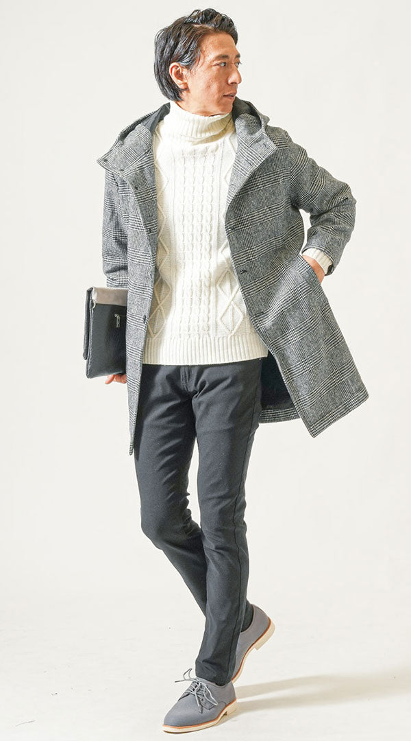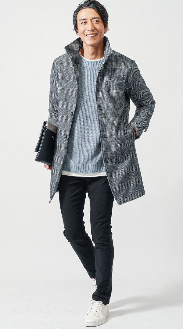 グレンチェックコートは、30代から50代の男性にこそ似合う品格ある柄アウターとして注目されています。「チェック柄は若い人向け」という固定観念を手放し、落ち着いたグレーベースのグレンチェック柄なら大人の男性でも上品に着こなせます。従来の細身シルエットにこだわらず、肩回りに程よいゆとりがあるデザインを選ぶことで体型変化をカバーしながらも洗練された印象を演出できるでしょう。春の通勤シーンではライトなグレンチェックコートをジャケット代わりに、秋冬は重厚感のある素材で防寒性も兼ね備えたスタイリングが可能です。きちんと感がありながらも堅すぎない絶妙なバランスは、職場の同僚や家族からも好印象を得られる頼れる一着となります。カジュアルからビジネスカジュアルまで幅広いシーンで活躍し、年相応の落ち着きと洒脱さを両立できるグレンチェックコートを、まずは豊富なコーディネート例と一緒にチェックしてみてください。