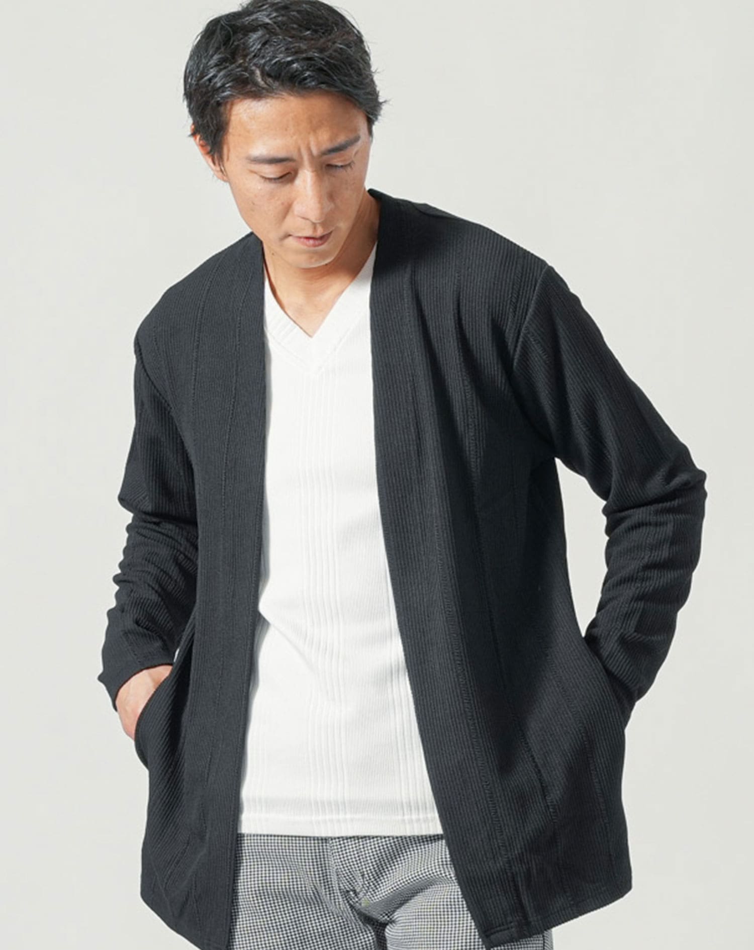 ノーカラーカーディガンは、襟なしのすっきりとした見た目で40代50代の男性にこそおすすめしたいアウターです。従来のカーディガンよりもVネックラインが洗練された印象を与えるため、職場の同僚や奥様からも「きちんとした大人らしい装い」として好印象を持たれやすいのが特徴です。肩回りや二の腕周りに程よいゆとりがあるため、体型の変化が気になる年代でも窮屈感なく快適に着用でき、シャツの上から羽織るだけで通勤スタイルが一気に大人っぽく仕上がります。きれいめからカジュアルまで幅広いコーディネートに対応し、春夏の冷房対策や秋口の温度調節にも重宝する着回し力の高さも魅力です。昔ながらの細身シルエットにこだわらず、今の自分の体型に合うゆったりとした落ち感のあるデザインを選ぶことで、無理のないおしゃれが楽しめます。まずは気になるデザインや色合いから、あなたにぴったりの一枚を見つけてください。