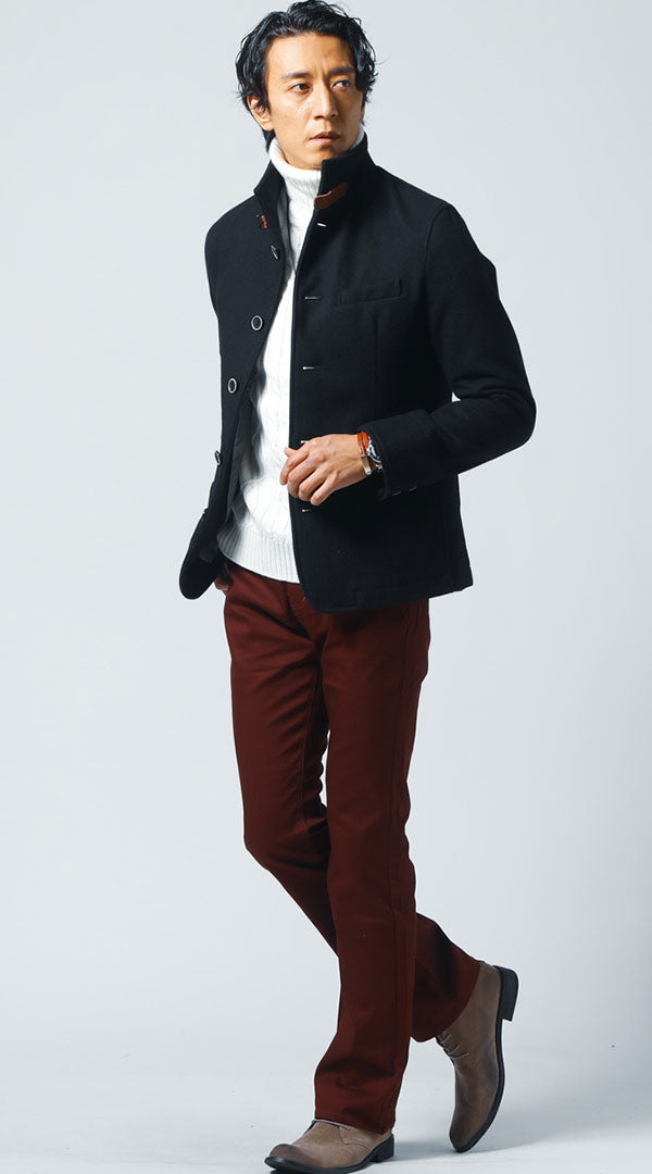 ワインレッドの赤タートルネックは、30代40代50代の男性が上品な大人の魅力を演出できる秋冬春の定番アイテムです。深みのある赤色が顔まわりを華やかに見せ、職場でも「きちんと感のある人」という好印象を与えてくれます。従来の細身シルエットにこだわらず、程よいゆとりのあるタートルネックなら肩回りや体型の変化も自然にカバーしながら、今らしいきれいめカジュアルスタイルが完成します。ジャケットのインナーとして通勤シーンに取り入れたり、カーディガンとの重ね着で休日のお出かけにも活躍する着回し力の高さも魅力です。グレーやネイビーのパンツと合わせれば失敗知らずのコーディネートが楽しめ、ベージュのチノパンと組み合わせれば洗練された大人の余裕を演出できます。まずは気になるスタイリングからチェックして、今の自分にぴったりの一枚を見つけてください。