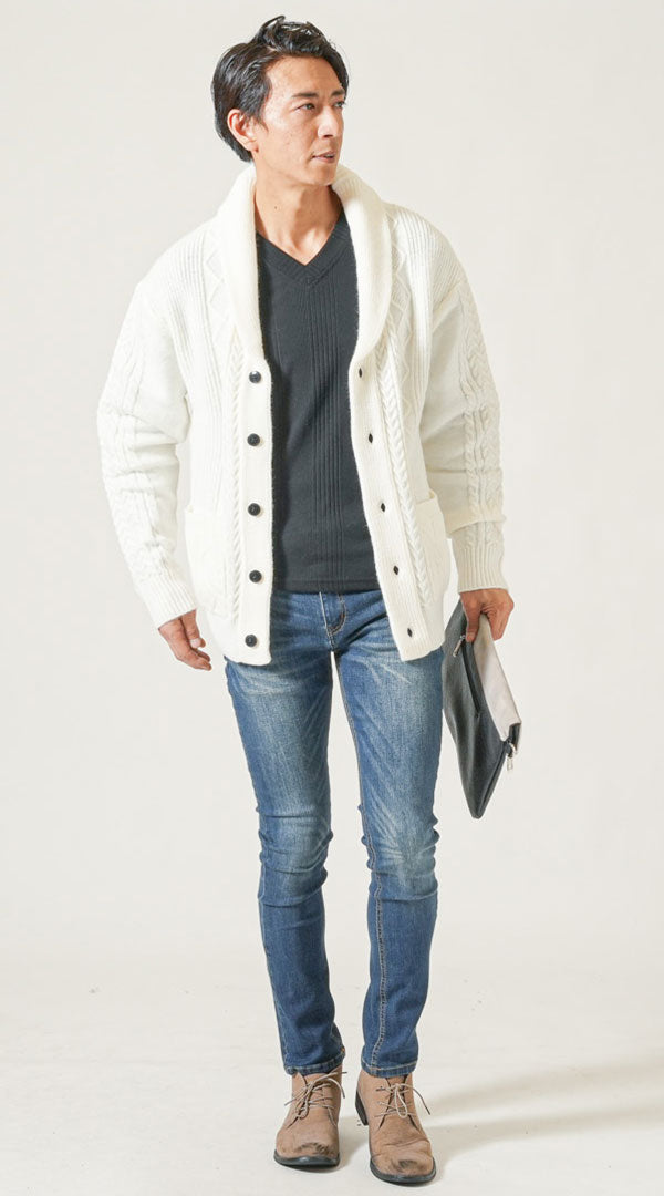 白カーディガンメンズコーデは、春夏秋冬を通じて30代40代50代の大人の男性に重宝するアイテムです。清潔感のある白は職場でも好印象を与えやすく、きれいめからカジュアルまで幅広いシーンで活躍します。かつては細身シルエットが主流でしたが、今は程よいゆとりのあるデザインが人気で、体型変化が気になる年代でも肩回りや二の腕周りが楽に着こなせます。春には薄手の七分袖や長袖を軽やかな羽織りとして、夏は通気性の良いサマーカーディガンでエアコン対策に、秋冬は厚手タイプで温度調節をしながら大人の落ち着いた印象を演出できます。休日の送迎や小旅行など、きちんと感を保ちつつリラックスしたい場面でも重宝し、シャツやTシャツとの着回しで季節を問わず活用できるのも魅力です。まずは気になるスタイルからチェックして、今の自分にぴったりの白カーディガンコーデを見つけてください。